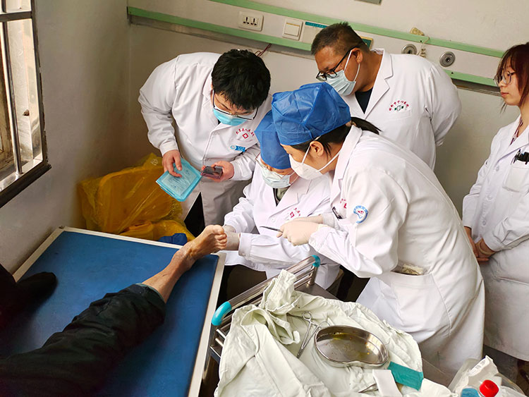 4月9日,應(yīng)大名縣醫(yī)院之邀,《中國燒傷創(chuàng)瘍雜志》常務(wù)編委、燒傷創(chuàng)瘍再生醫(yī)療技術(shù)臨床專家趙瑞慶,在該院骨科病區(qū)、內(nèi)分泌病區(qū),使用再生醫(yī)療技術(shù)連續(xù)會診了七例患者(糖足潰瘍4例、靜脈曲張潰瘍1例、足跟跟腱感染1例、髕骨骨折術(shù)后切口感染)。事后在醫(yī)辦室逐個病案展開討論點(diǎn)評,并且制定岀詳細(xì)的治療方法,受到當(dāng)?shù)蒯t(yī)護(hù)人員家屬的熱情稱贊。