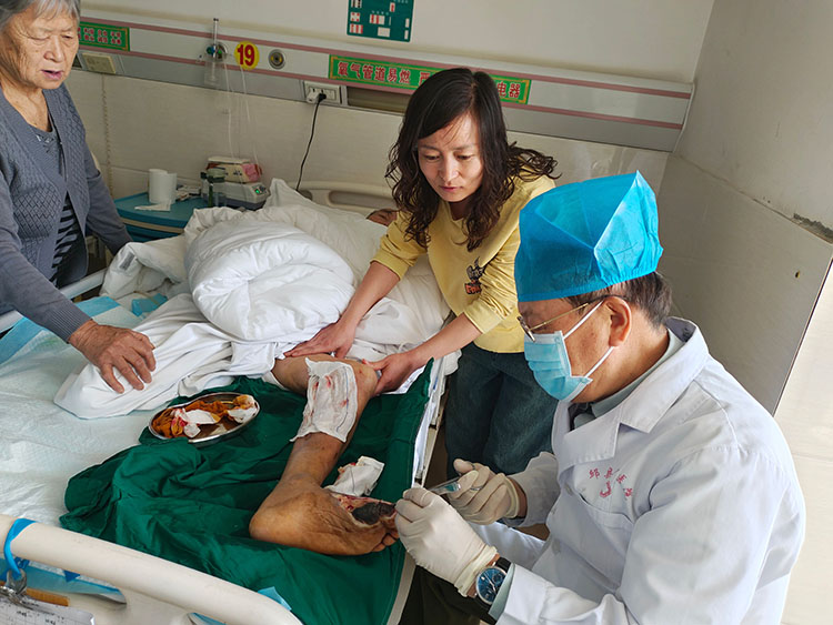 4月10日,《中國燒傷創(chuàng)瘍雜志》常務(wù)編委、燒傷創(chuàng)瘍再生醫(yī)療技術(shù)臨床專家趙瑞慶,應(yīng)邱縣中醫(yī)院急會診邀請,采用再生醫(yī)療技術(shù)會診了糖尿病合并癥患者。該患者四個月前曾在北京某醫(yī)院就診,未見好轉(zhuǎn),故轉(zhuǎn)回當(dāng)?shù)蒯t(yī)院治療。事后趙教授和當(dāng)?shù)蒯t(yī)護(hù)人員,認(rèn)真討論了發(fā)病的過程,并且制定了具體的治療計劃,強(qiáng)調(diào)注意觀察各階段的病情變化,嚴(yán)格落實各階段的治療措施。