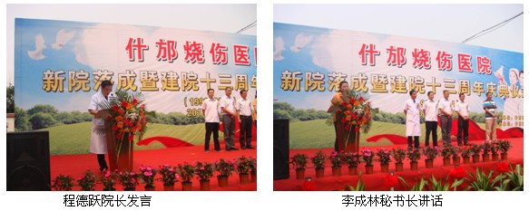 什邡市衛(wèi)生局葉代泉局長、什邡市張道彬市長、四川省中西醫(yī)結(jié)合學(xué)會李成林秘書長分別發(fā)言,他們對什邡燒傷醫(yī)院新院落成暨建院十三周年表示衷心祝賀,對醫(yī)院的發(fā)展提出要求和希望。