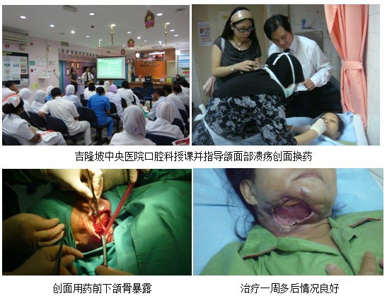 在整個(gè)醫(yī)療開發(fā)過程中,醫(yī)療開發(fā)團(tuán)隊(duì)也結(jié)識(shí)了許許多多醫(yī)界同仁并成為良好的伙伴,如Dr. Nurhalizah,她是在全馬最大政府醫(yī)院吉隆坡中央醫(yī)院婦產(chǎn)科工作的資深主任醫(yī)師,同時(shí)也是再生醫(yī)學(xué)忠實(shí)的追隨者和實(shí)踐人,在胡教授的指導(dǎo)下,經(jīng)她規(guī)范應(yīng)用再生醫(yī)學(xué)技術(shù)治療的多例婦產(chǎn)科手術(shù)切口感染病人很快就成功地治愈并康復(fù)出院。嘗到了先進(jìn)技術(shù)和產(chǎn)品帶來的勝利的喜悅后,她又無(wú)私地將該技術(shù)引薦給該院的口腔科,幫助該科解決一例頭疼的難愈性創(chuàng)面。這例有糖尿病史的病人在拔牙后感染引起右頜面部整個(gè)組織的潰爛,連下頜骨都暴露出來,慘不忍睹。經(jīng)胡教授的指導(dǎo)和示教換藥后一周,該患者的病情穩(wěn)定,創(chuàng)面明顯得到了改善,新生肉芽組織長(zhǎng)勢(shì)良好,而隨后的授課講解進(jìn)一步打消了醫(yī)生們對(duì)下一步治療的所有疑惑和顧慮,掌握了要領(lǐng),使醫(yī)生們感到驚奇的同時(shí)建立了百倍的信心。