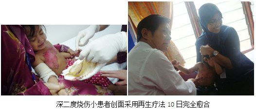 另一例會(huì)診的病例也是來自吉隆坡中央醫(yī)院,患者是該院康復(fù)科一名醫(yī)生年幼的女兒,不幸被開水燙傷,整個(gè)胸部和右上臂為深二度燒傷,在美寶醫(yī)療團(tuán)隊(duì)到來之前,他們使用干性輔料給予治療,不僅效果不明顯,且干性療法的紗布與創(chuàng)面嚴(yán)重粘連,使每次的換藥都成了孩子最難以忍受的折磨。萬(wàn)般無(wú)奈之時(shí),該醫(yī)生得知美寶醫(yī)療隊(duì)在大馬的情況并隨即發(fā)出求助,經(jīng)胡主任的會(huì)診,該小患者立刻改用再生療法并在10天之內(nèi)就全部愈合,換藥再也不哭不鬧,家人和醫(yī)生都十分感激。