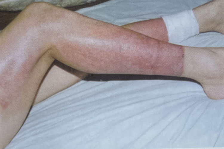 2. 眼觀表現(xiàn):局部紅腫明顯,起水皰、壁薄,內(nèi)含淡黃色血漿樣液體,劇痛;水皰破后創(chuàng)面可見(jiàn)潮紅、濕潤(rùn),質(zhì)地較軟,溫度較高。