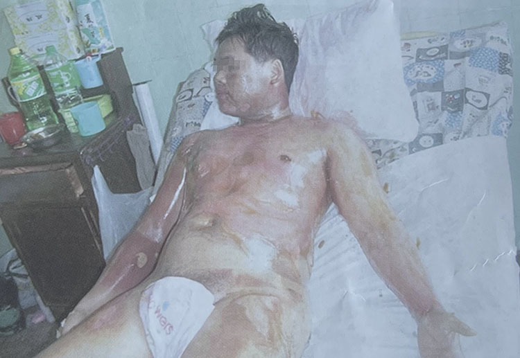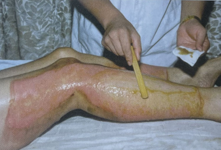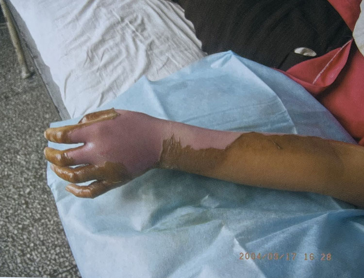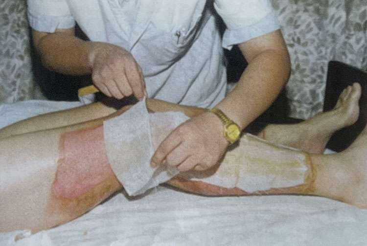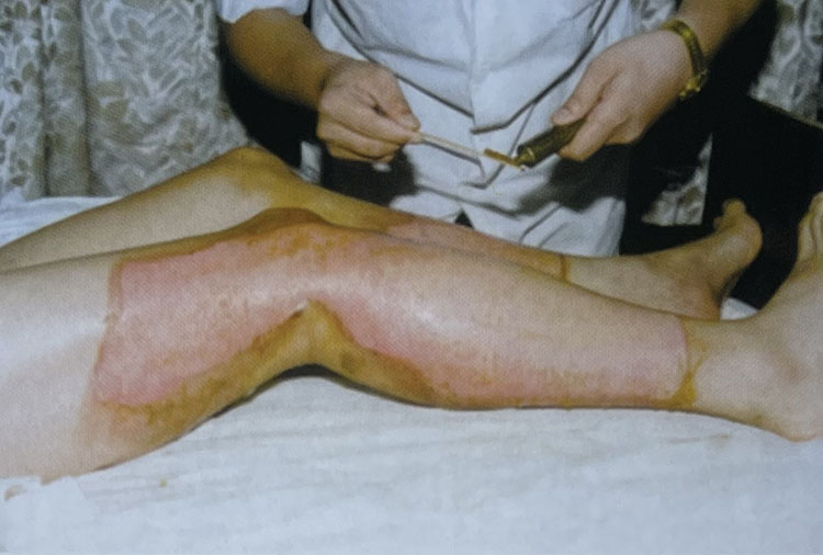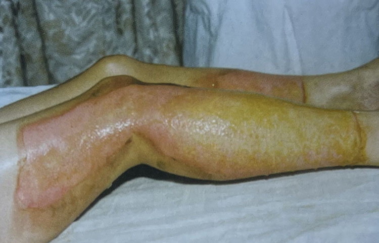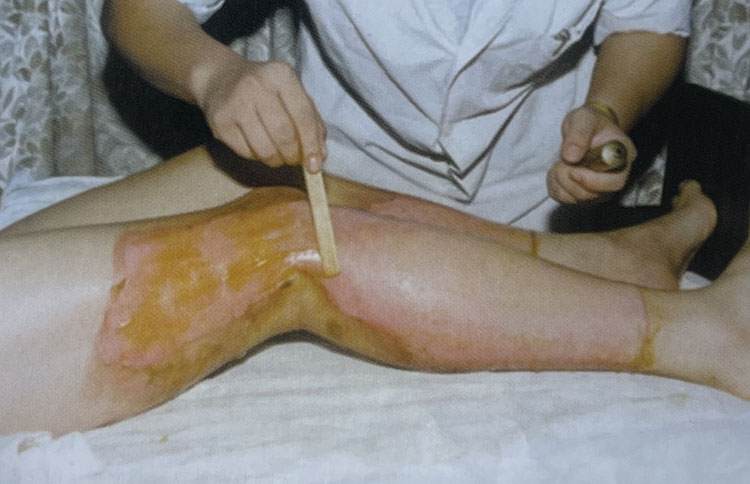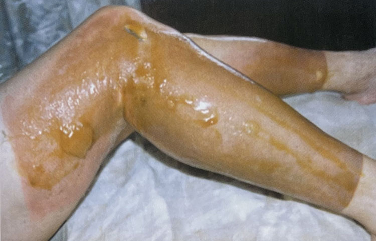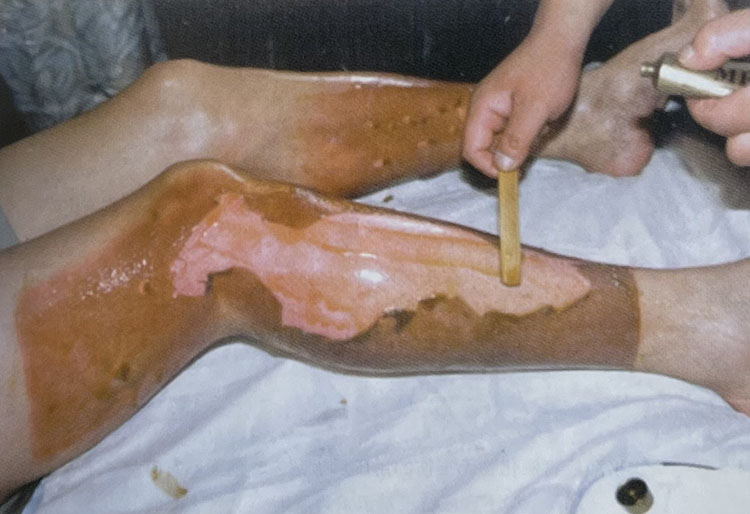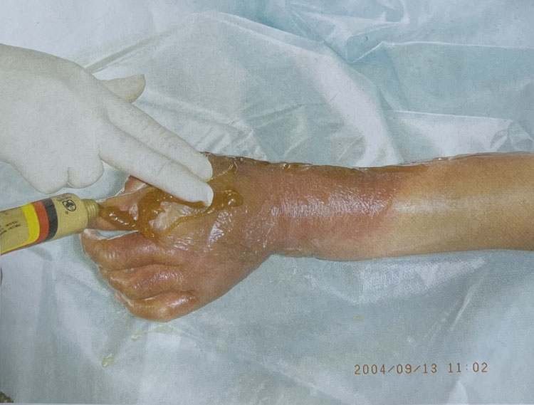 2. 有些傷員來(lái)診時(shí)皰皮已經(jīng)擦掉脫落,可以見(jiàn)到創(chuàng)面充血紅潤(rùn)呈鮮紅色,仔細(xì)觀察可見(jiàn)高度充血的密集血管網(wǎng)形成,同時(shí)由于皮下豐富的神經(jīng)末梢活性尚存,所以創(chuàng)面疼痛較明顯。在外涂MEBO保護(hù)創(chuàng)面后疼痛明顯減輕,同時(shí)創(chuàng)面豐富的毛細(xì)血管網(wǎng)也在生理濕潤(rùn)環(huán)境的保護(hù)下保持通暢,維持生理功能。