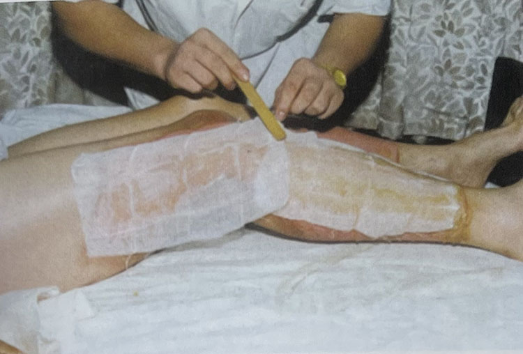 圖 2-5-7 傷后立即將 MEBO 涂于創(chuàng)面 1mm厚(12小時(shí)內(nèi)用藥效果最佳)。