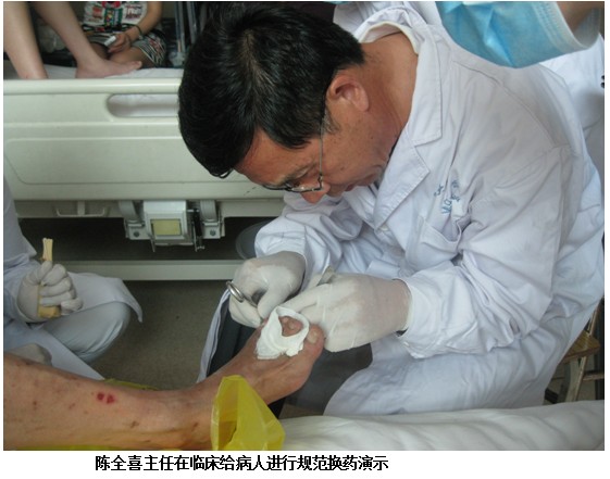 22日上午11點,陳全喜主任按時到鄭大一附院3號病房樓,在孫主任的陪同下,進(jìn)行了糖尿病足潰瘍創(chuàng)面不愈會診,會診后在科室對孫主任和四位研究生進(jìn)行了“皮膚原位再生醫(yī)療技術(shù)”的學(xué)術(shù)交流,孫主任邀請陳全喜主任做臨床換藥演示。陳全喜主任在病房對糖尿病患者右足潰瘍創(chuàng)面進(jìn)行了規(guī)模換藥示范。