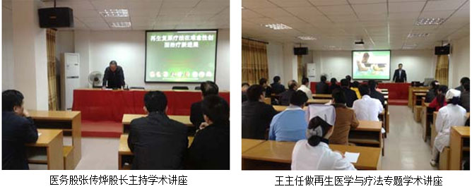 醫(yī)務股張傳燁股長提前等候在大門口迎接王主任的到來,會議室坐滿了醫(yī)院各相關(guān)科室的30多名醫(yī)務人員,在學術(shù)講座開始前,王主任首先向與會專家和醫(yī)護人員通報了我國著名生命科學家、醫(yī)學家徐榮祥教授在美國起訴諾獎委的相關(guān)信息,然后以圖文并茂和詳實的圖像資料把再生療法在臨床各個方面的規(guī)范化應用作了深入淺出的演示講解,課后還就醫(yī)生們提出的臨床治療中各類問題一一作詳細的解答和指導。會后,彭俊生院長親自到來感謝并希望今后能得到更好的技術(shù)支持。
