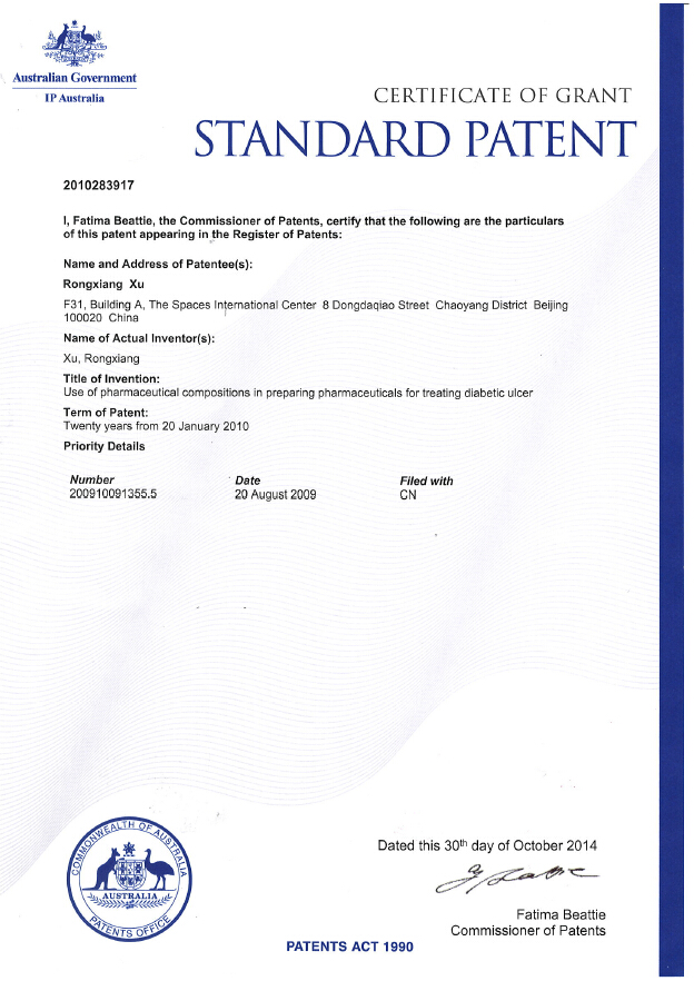 藥物組合物在制備治療糖尿病潰瘍藥物中的用途再獲澳大利亞專(zhuān)利