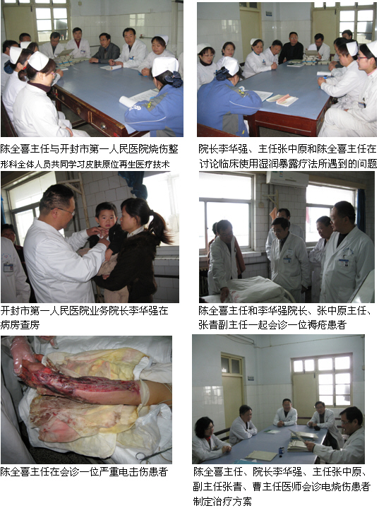 2010年4月18日,北京創(chuàng)瘍研究所副主任醫(yī)師陳全喜應(yīng)河南省開封市第一人民醫(yī)院的邀請,來到該院的燒傷整形科為該科室的醫(yī)生們進(jìn)行再生醫(yī)療技術(shù)培訓(xùn)。會議開始前,陳全喜主任在李華強(qiáng)院長的陪同下一同到病房為患者進(jìn)行會診,針對個別病例與醫(yī)生們一起探討,并制定治療方案。該院的業(yè)務(wù)院長李華強(qiáng)、燒傷科主任張中原在培訓(xùn)講座開始前,向大家簡單地介紹了陳全喜主任及再生醫(yī)療技術(shù)在燒傷、創(chuàng)傷與潰瘍治療領(lǐng)域所取得的輝煌成就,并強(qiáng)調(diào)了學(xué)習(xí)再生醫(yī)療技術(shù)的必要性。