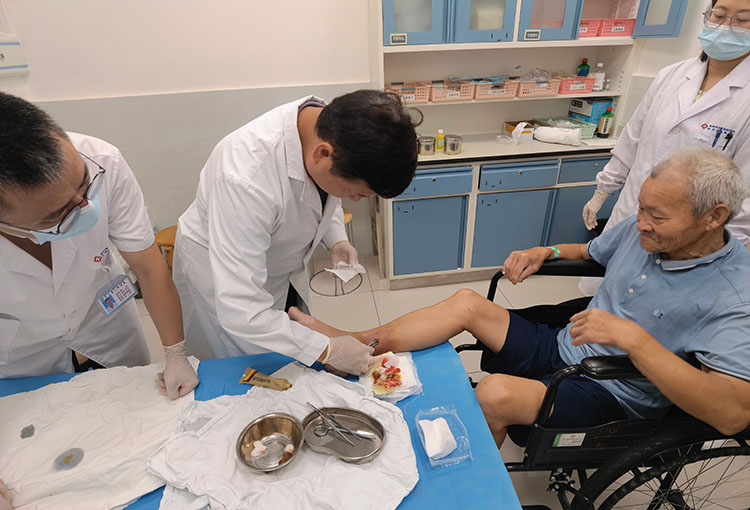 2025年7月1日,中國中西醫(yī)結(jié)合學(xué)會燒傷專業(yè)委員會常務(wù)委員、《中國燒傷創(chuàng)瘍雜志》副總編輯王洪生,應(yīng)東莞市樟木頭石新醫(yī)院外一科傅桂軍主任邀請,來到該科室會診一例術(shù)后慢性難愈性創(chuàng)面,王教授給出了創(chuàng)面處理指導(dǎo)意見及手術(shù)方案;下午來到東莞市濱海灣中心醫(yī)院燒傷整形科,會診了糖足,壓瘡病人共5例,并指導(dǎo)燒傷整形科主任廖鏘云主任共同參與一例糖足病人的手術(shù)。在王教授的指導(dǎo)下,科室臨床醫(yī)生們學(xué)到了術(shù)前如何快速讓病人止痛及手術(shù)清創(chuàng)等高難度技術(shù)演示,術(shù)后病人非常滿意,本次會診獲得醫(yī)護(hù)人員的一致稱贊!