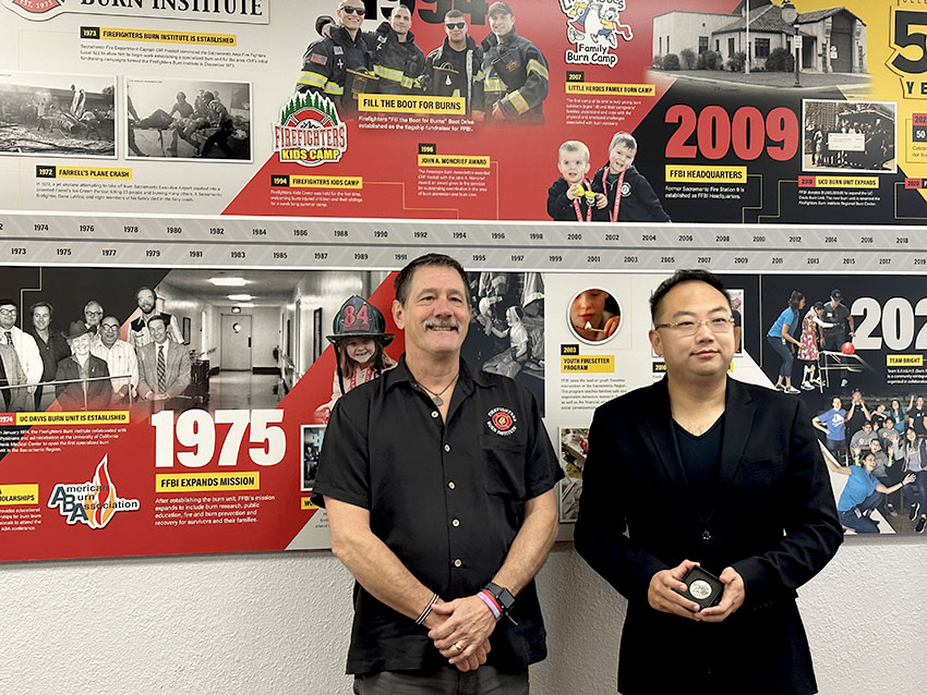 該研究所執(zhí)行董事Joe Pick熱情接待徐鵬主席一行并介紹了FFBI的歷史及使命。FFBI是一家創(chuàng)建了50年的非營利機(jī)構(gòu),專注于燒傷患者治療后的身心康復(fù)和生活質(zhì)量提高,以及火災(zāi)預(yù)防科普及教育。徐鵬主席則具體介紹了美寶國際與薩克拉門托國王隊在表彰消防員方面的合作以及與UC Davis燒傷研究所在燒傷治療FDA臨床研究領(lǐng)域的合作,并介紹了與美國燒傷學(xué)會(ABA)合作的Empathy Museum 項目,這一項目通過對傳統(tǒng)燒傷治療造成的副作用及后遺癥對患者傷后生活的嚴(yán)重影響的展示,呼吁預(yù)防燒傷及更優(yōu)質(zhì)的燒傷技術(shù)的普及。