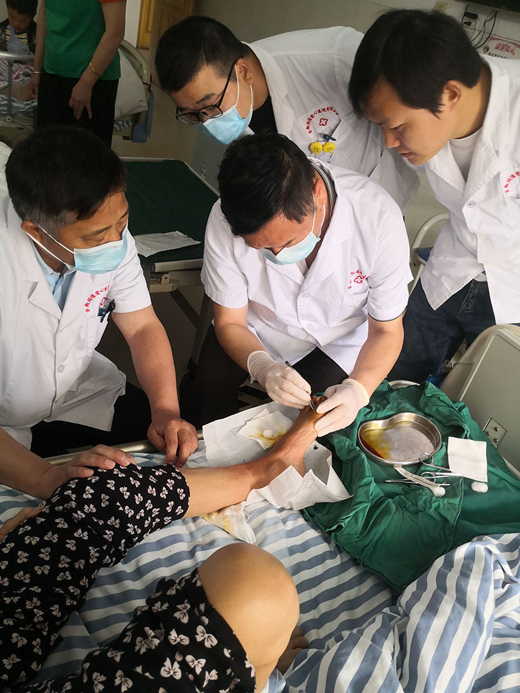2023年5月19日,中國(guó)中西醫(yī)結(jié)合學(xué)會(huì)燒傷專業(yè)委員會(huì)醫(yī)療部張主任應(yīng)邀前往全椒縣同德愛(ài)心醫(yī)院,會(huì)診一例糖尿病足患者和一例褥瘡患者,張主任親自對(duì)創(chuàng)面進(jìn)行清創(chuàng),講解應(yīng)用再生醫(yī)療技術(shù)處理創(chuàng)面及換藥方法。會(huì)診結(jié)束后和醫(yī)生進(jìn)行了病情分析及治療方案的制定。