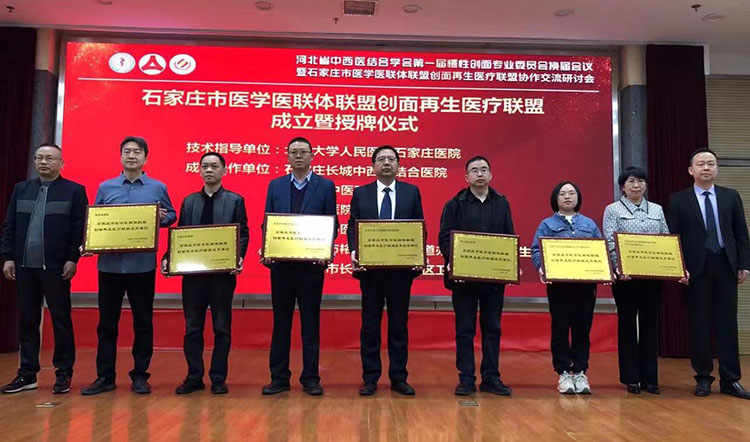 石家莊市醫(yī)學醫(yī)聯體聯盟創(chuàng)面再生醫(yī)療聯盟在此次大會上宣布成立。石家莊市醫(yī)學醫(yī)聯體聯盟是由北京大學人民醫(yī)院石家莊醫(yī)院牽頭成立的,此次依托石家莊市醫(yī)學醫(yī)聯體聯盟,成立了以技術協作交流為紐帶的專業(yè)聯盟組織。安雄彪副院長和方進勇教授為聯盟第一批成員單位授牌。