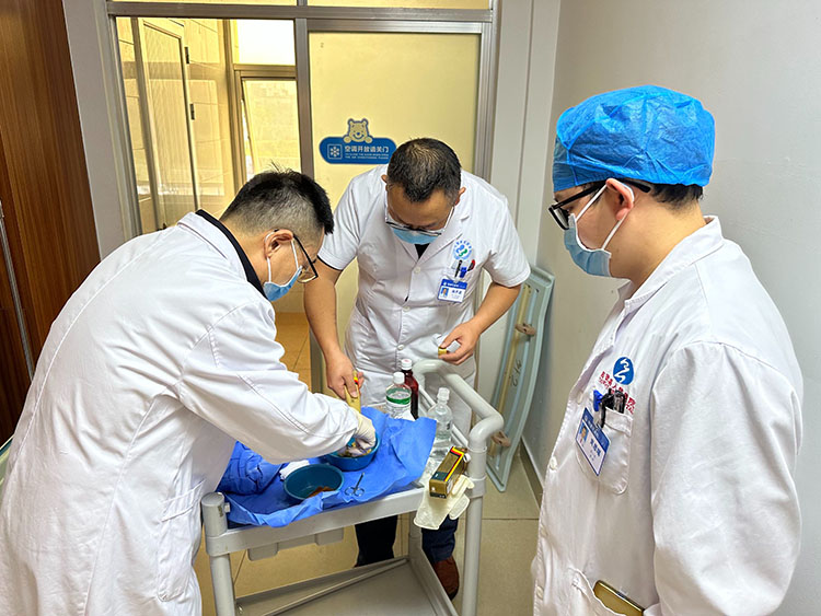 2023年2月27日,應(yīng)霍邱縣第二人民醫(yī)院燒傷科主任徐凡的邀請(qǐng),中國(guó)中西醫(yī)結(jié)合學(xué)會(huì)燒傷專業(yè)委員會(huì)醫(yī)療部張強(qiáng)主任來院會(huì)診2例燒傷和1例血管閉塞性潰瘍病人,現(xiàn)場(chǎng)講解了再生醫(yī)療技術(shù)換藥技術(shù)要點(diǎn)并演示做油紗換藥。
