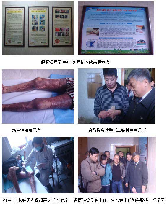 借此年會(huì),金黨軍教授和湖北辦事處黃彥勇主任到MEBO燒傷基地醫(yī)院宜昌市中醫(yī)醫(yī)院燒傷整形科做了回訪工作,并邀約宜都市第一人民醫(yī)院燒傷科徐偉主任、秭歸縣人民醫(yī)院燒傷科史永松主任、興山縣人民醫(yī)院燒傷科張衛(wèi)東主任、五峰縣人民醫(yī)院燒傷科鮮于文濤主任和陳宏宇護(hù)士長(zhǎng)同行參觀和學(xué)習(xí)。在疤痕治療室,百忙之中,文琳護(hù)士長(zhǎng)熱情接待了我們,也請(qǐng)金教授為做治療的患者進(jìn)行了會(huì)診,并操作了美寶疤痕軟膏結(jié)合超聲波導(dǎo)入的治療,同時(shí)肯定了此項(xiàng)技術(shù)所獲得的理想且安全的效果。