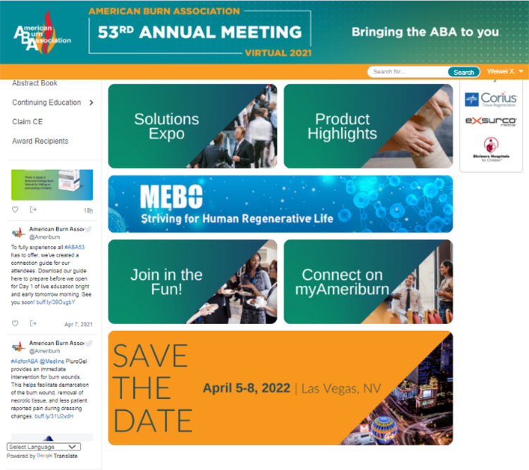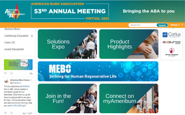 ABA線上會議不僅為燒傷領(lǐng)域的專家提供了良好的學(xué)術(shù)交流機會,也為各企業(yè)展示其產(chǎn)品與技術(shù)提供了廣闊的平臺,來自全球的40多家知名醫(yī)藥企業(yè)參加了此次會議。自2016年以來,美寶國際已經(jīng)連續(xù)4年參加了ABA年會:第49屆波士頓年會、第50屆芝加哥年會,第51屆拉斯維加斯年會,以及2020年線上會議。今年,美寶國際再度受邀參加2021年ABA線上會議,與全球?qū)<液推髽I(yè)一道,探索與推動燒傷治療的未來發(fā)展,并將繼續(xù)以再生生命科學(xué)領(lǐng)航者的身份,促進全球再生生命科學(xué)的持續(xù)發(fā)展與科技創(chuàng)新。