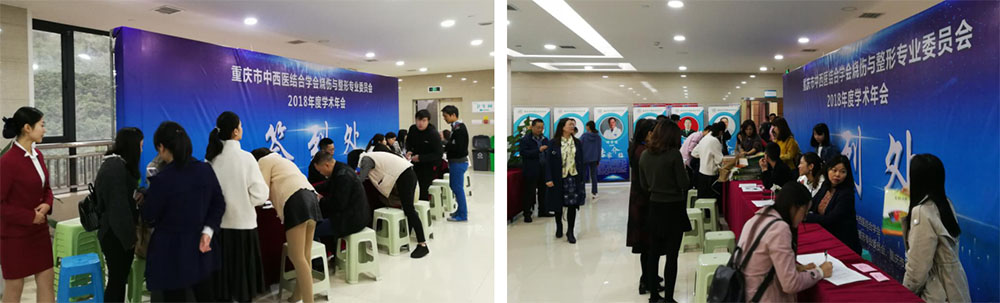 早上7點30分,會場外簽到處前來報道的醫(yī)護人員絡繹不絕,好生熱鬧,工作人員和前來簽到的參會代表都忙得不可開交,截至到大會開始前,前來簽到的人員就有重慶醫(yī)科大學附屬第一醫(yī)院、重慶醫(yī)科大學附屬第二醫(yī)院、重慶醫(yī)科大學附屬永川醫(yī)院、陸軍軍醫(yī)大學大坪醫(yī)院、重慶市中醫(yī)院、解放軍第324醫(yī)院、重慶武警總隊醫(yī)院、重慶華美整形美容醫(yī)院等各市級醫(yī)院、區(qū)縣級醫(yī)院及各私立醫(yī)院60余家單位200多人。