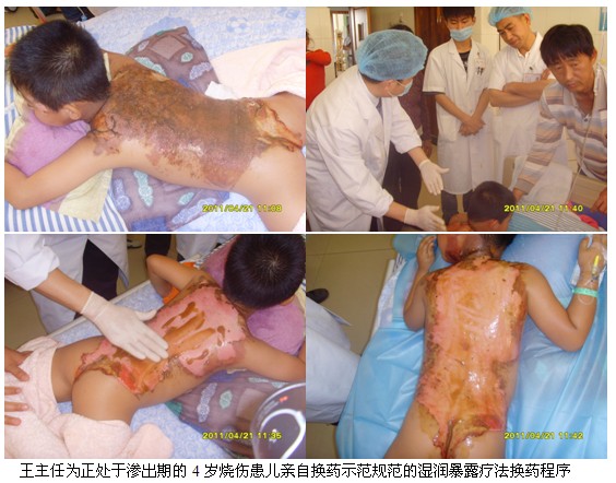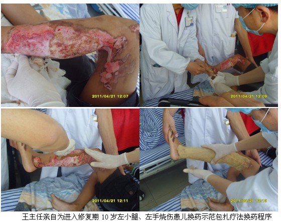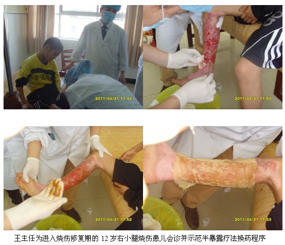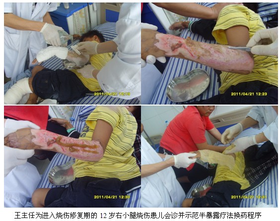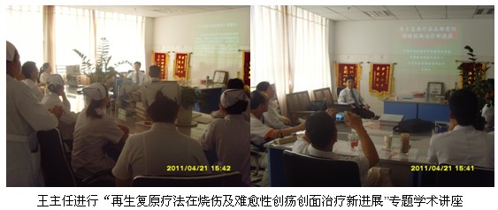 4月21日上午9時,王洪生主任應(yīng)邀到該院該院燒傷外科為正在住院的多名燒傷創(chuàng)瘍患者會診,并親自為多名患者換藥,示范不同深度燒傷及不同時期燒傷創(chuàng)面規(guī)范的處理方法。整個臨床示教及會診一直持續(xù)到當(dāng)日近12時才結(jié)束。當(dāng)日下午14:30分,王主任應(yīng)邀再次到該醫(yī)院燒傷外科會議室為兩個外科的醫(yī)護(hù)人員進(jìn)行“再生復(fù)原療法在燒傷及難治性創(chuàng)瘍創(chuàng)面治療的新進(jìn)展”專題學(xué)術(shù)講座。