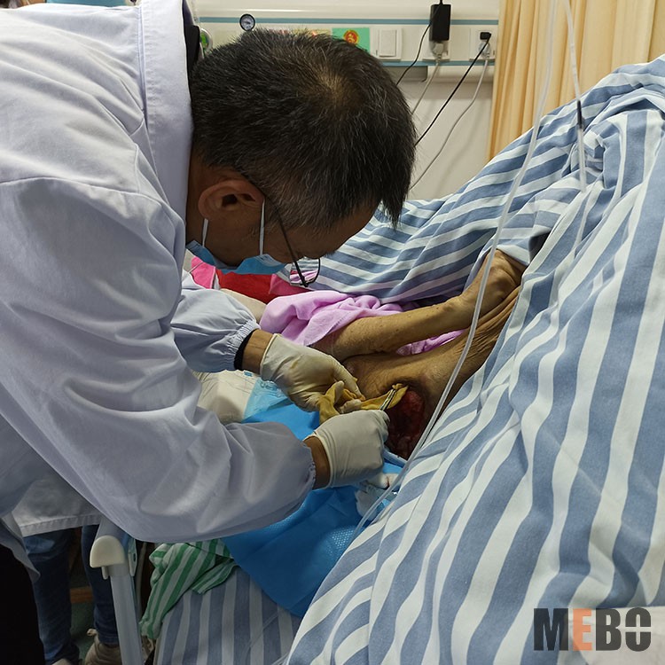 培訓(xùn)結(jié)束后,方教授指導(dǎo)醫(yī)護(hù)人員為癌癥晚期4期壓瘡病人清創(chuàng),應(yīng)用再生醫(yī)療技術(shù)及濕潤(rùn)燒傷膏做油紗換藥治療。