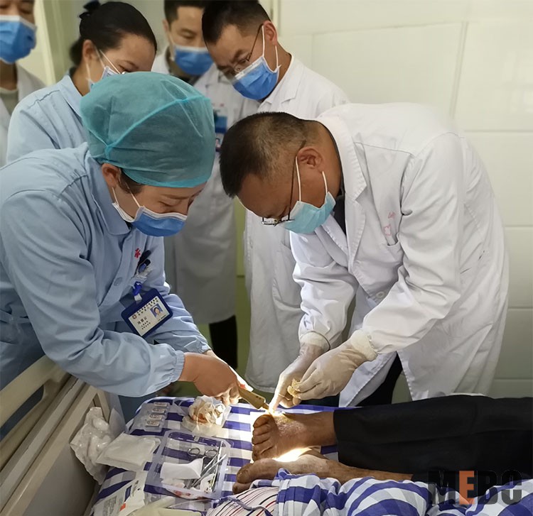 方教授在云和縣人民醫(yī)院,指導(dǎo)醫(yī)護(hù)人員為4級(jí)糖尿病足病人清創(chuàng),應(yīng)用再生醫(yī)療技術(shù)及濕潤(rùn)燒傷膏換藥治療。
