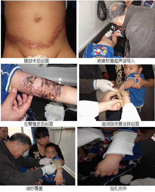 參會期間,金教授應邀再次來到三峽大學仁和醫(yī)院手外整形科,為一位五歲左右的小男孩會診疤痕皮膚的治療?;颊咦蟊蹮齻?,從腹部取皮移植到手臂上,術后兩周腹部疤痕開始使用疤痕軟膏,已做導入治療一周,手臂還有黑痂?;颊吣赣H自述使用軟膏后疤痕變軟,金教授為小患者耐心做了疤痕軟膏導入治療,并為手臂換藥推薦了再生醫(yī)療技術濕性療法。主治醫(yī)師羅醫(yī)生和護理人員們也學習了濕潤燒傷膏油紗條的制作和規(guī)范換藥方法。