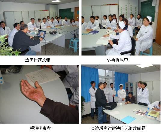 學(xué)術(shù)會議由戴主任主持,金教授先向大家介紹了燒傷及燒傷皮膚原位再生醫(yī)療技術(shù)的概念,而該技術(shù)是由濕潤暴露療法和濕潤燒傷膏來共同完成;介紹了暴露療法創(chuàng)面處理的原則、處理方式、規(guī)范換藥技術(shù)以及各類深淺度燒傷、潰瘍、褥瘡、糖尿病足、斷指再生等創(chuàng)面的處理方法;并通過展示大量真實的臨床病例圖片,使大家真正了解皮膚原位再生醫(yī)療技術(shù)及其再生產(chǎn)品的先進性、實用性;隨后金教授介紹了再生醫(yī)療技術(shù)新產(chǎn)品—創(chuàng)瘍貼對壓瘡、糖尿病足潰瘍等創(chuàng)面的治療,并介紹了其作用原理、產(chǎn)品組成結(jié)構(gòu)、各類創(chuàng)面使用的方法等;還著重講解了在5.12四川災(zāi)區(qū)應(yīng)用再生醫(yī)療技術(shù)治療眾多患者所取得的良好療效。在金教授課結(jié)束后,參會人員結(jié)合實際工作中所遇的問題紛紛提問,如取皮后,使用濕潤燒傷膏或速愈貼遇滲血情況如何處理,燒傷膏油紗條如何制作,III度燒傷創(chuàng)面是否采用包扎療法等,現(xiàn)場氣氛十分活躍,金教授一一為大家做了細致回答,并在會議結(jié)束后對一位手部創(chuàng)傷患者進行了會診。