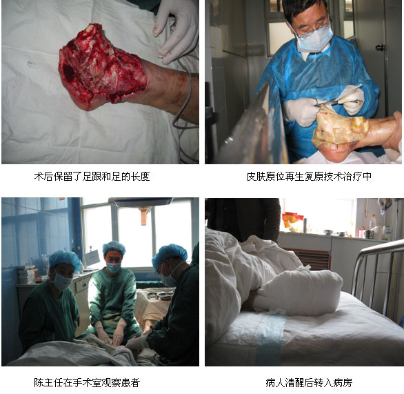 之后專家組與患者子女溝通,她們不同意截肢,要求用最好的技術(shù)、最小的損傷來治療母親疾病。根據(jù)家屬的要求,醫(yī)院決定應(yīng)用皮膚原位再生復(fù)原技術(shù)千方百計(jì)保住患者肢體,治療結(jié)果達(dá)到家屬滿意。在陳全喜主任的指導(dǎo)下,經(jīng)過二天的搶救,壞死組織被清除,病人蘇醒了。病人家屬握住陳主任的手說:是你們的技術(shù)救了我母親的命,保住了母親的一條腿呀。
