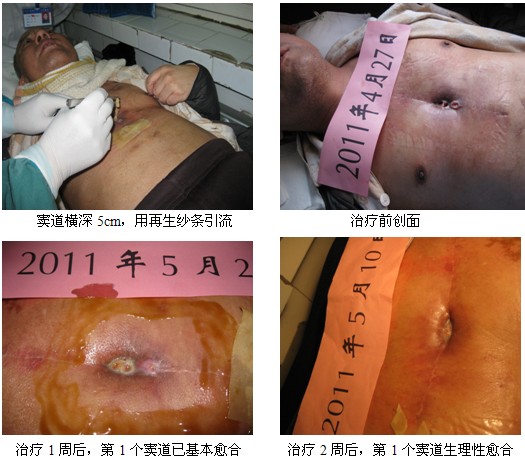 通過1周的治療,其中1個竇道被修復(fù),體溫由原來的38.5℃下降到36.4℃,咳嗽較前明顯減輕。治療到2011年5月17日,2個竇道已達(dá)到生理性愈合,患者體溫穩(wěn)定在36.4℃~36.6℃之間,通過物理治療,患者已不再咳嗽,食欲明顯好轉(zhuǎn),大小便正常。第3個竇道在皮膚原位再生醫(yī)療技術(shù)的規(guī)范治療下正在康復(fù)中。