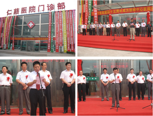 2010年8月8日,中國燒傷創(chuàng)瘍科技中心武安分中心、河北武安仁慈醫(yī)院舉行建院十五周年暨門診大樓落成、邯鄲市中心醫(yī)院技術(shù)協(xié)作醫(yī)院成立慶?;顒?。三喜臨門,武安市仁慈醫(yī)院張燈結(jié)彩,從醫(yī)院領(lǐng)導(dǎo)到全體員工精神煥發(fā)、喜氣洋洋,武安市領(lǐng)導(dǎo)和人大、政協(xié)以及衛(wèi)生界各級領(lǐng)導(dǎo)出席盛會,武安市各級醫(yī)院代表到會祝賀。