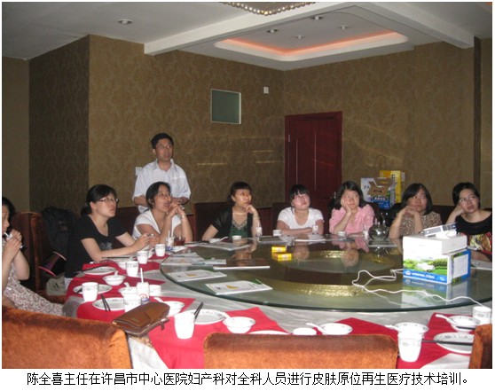 2012年5月17日,中國中西醫(yī)結(jié)合學(xué)會燒傷專業(yè)委員會委員,北京美寶燒傷創(chuàng)瘍研究所臨床技術(shù)推廣部主任陳全喜和河南辦事處總裁趙俊國、區(qū)域經(jīng)理葛艷妍應(yīng)邀,來到了許昌市中心醫(yī)院婦產(chǎn)科,受到婦產(chǎn)科主任龔軍、陳書霞的熱情接待。陳全喜主任再次來到該院進行更深入的皮膚原位再生醫(yī)療技術(shù)及其在臨床應(yīng)用培訓(xùn)。