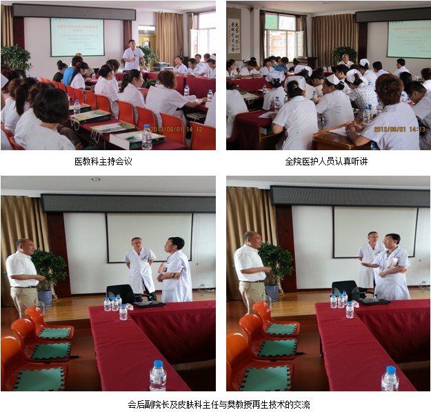 2013年8月1日,中國中西醫(yī)結合學會燒傷專業(yè)委員會、北京燒傷創(chuàng)瘍研究所專家樊兆宗教授受邀來到了醫(yī)院進行再生醫(yī)療技術培訓。這次培訓活動由醫(yī)教科科長主持會議,全院普外科、骨科、內科、肛腸科等主要科室100多位醫(yī)護人員參加。結合醫(yī)院參加培訓醫(yī)護人員科室分布的特點,樊教授授課內容主要包括以下二大部分:1、講述了我國著名生命科學家徐榮祥教授最新生命科學進展,包括人體再生復原科學被納入美國發(fā)展國策等;2、近年來在人體再生復原科學研究領域所取得的重大臨床及實驗研究成果,再生醫(yī)療技術治療各類難愈性創(chuàng)傷潰瘍創(chuàng)面、如糖尿病足、外科和骨科皮膚損傷潰瘍、手術切口感染、褥瘡、斷指再生等疾病如何實現(xiàn)了創(chuàng)面愈合且疤痕少、無功能障礙。其治療機理是什么?為什么要強調規(guī)范治療?各病種規(guī)范治療的要點等。講座期間,醫(yī)護人員都做了筆記,對再生醫(yī)療技術學習熱情高漲。