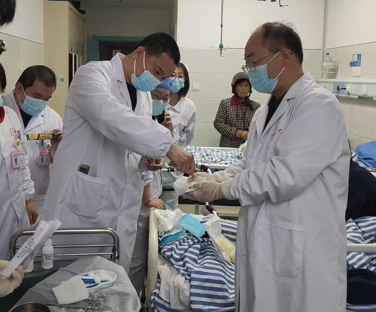 11月18日,應贛州市中醫(yī)院創(chuàng)傷骨科廖主任的邀請,《中國燒傷創(chuàng)瘍雜志》編委、燒傷創(chuàng)瘍再生醫(yī)療技術臨床專家金黨軍和江西省總陳立新以及贛州地區(qū)負責人肖曉春,一起來到贛州市中醫(yī)院創(chuàng)傷骨科與廖副主任和壓瘡小組蔡護士長一起會診了三例糖尿病足患者、一例壓瘡患者,之后進行了深入的學術交流,獲得了廖主任和蔡護士長的高度認可和贊揚。