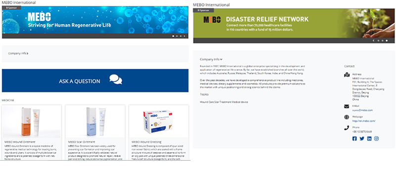 美寶國際精心設(shè)計(jì)的在線展臺(tái),力求從多方面向與會(huì)者展示企業(yè)風(fēng)采。在產(chǎn)品方面,不僅展示了濕潤燒傷膏、疤痕軟膏等已在全球應(yīng)用數(shù)十年的核心產(chǎn)品,還重點(diǎn)介紹了近期在美國成功注冊(cè)的創(chuàng)瘍帖。同時(shí),在展臺(tái)醒目的位置上,特別呈現(xiàn)了近日我們?cè)诼?lián)合國75周年峰會(huì)上提出的全球倡議——與全球110個(gè)國家7萬多家醫(yī)療機(jī)構(gòu)合作,建立全球?yàn)?zāi)難與救援網(wǎng)絡(luò)。