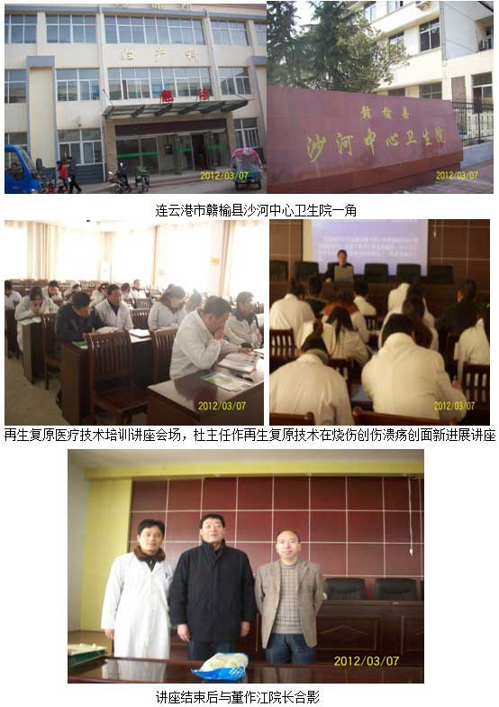 2012年3月7日下午14:00應(yīng)沙河鎮(zhèn)醫(yī)院董作江院長兼外科主任的邀請,杜主任一行為沙河醫(yī)院舉辦了“再生復(fù)原技術(shù)在燒傷創(chuàng)傷潰瘍創(chuàng)面應(yīng)用新進展”技術(shù)講座。