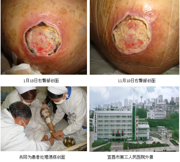 2010年12月17日至12月19日,中國中西醫(yī)結合學會燒傷專業(yè)委員會金黨軍教授在對宜昌市各醫(yī)院走訪期間,應該院外科汪長青主任和全麗麗護士長的邀請,對剛入院的一位腦梗塞偏癱老年患者多發(fā)性褥瘡創(chuàng)面進行了臨床換藥指導。該患已79歲高齡,金教授見到患者時,背部褥瘡結黑痂,左臀部形成空腔,這兩處面積較大,伴有惡臭;另右臀部、膝蓋、左小腿及左腳均有潰瘍創(chuàng)面,并伴低蛋白血糖和疝氣。在全護士長等護士的陪同下,金教授為患者耐心地清洗周邊的創(chuàng)面,剪去黑痂,空腔上使用濕潤燒傷膏油紗條填塞,并采用藥膏和創(chuàng)瘍貼結合換藥,金教授通過兩個多小時實際操作,詮釋了再生醫(yī)療技術對創(chuàng)面的處理要點,隨后金教授結合多媒體材料為現(xiàn)場的醫(yī)護人員講解了再生醫(yī)療技術在燒傷、創(chuàng)瘍、褥瘡、潰瘍等創(chuàng)面的應用,講課結束后,現(xiàn)場的醫(yī)護人員表示通過看到金教授親自為患者換藥及他精彩地講課,使大家實實在在地掌握了原位再生復原醫(yī)療技術的規(guī)范換藥及其在臨床各科室的廣泛應用,今后會不斷提高原位再生復原醫(yī)療技術水平,救治更多患者。