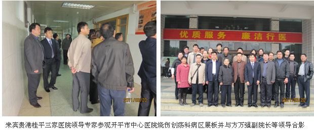 為打造優(yōu)勢專科,在中國中西醫(yī)結(jié)合學會燒傷專業(yè)委員會常委、中國燒傷創(chuàng)瘍雜志副總編輯、北京燒傷創(chuàng)瘍研究所副所長、臨床研究部王洪生主任的精心安排下,廣西來賓市中醫(yī)醫(yī)院、貴港市中醫(yī)醫(yī)院、桂平市中醫(yī)醫(yī)院三家醫(yī)院的院長親自掛帥,帶領(lǐng)院級領(lǐng)導及相關(guān)科室主任、護理部主任、護士長和相關(guān)專業(yè)專家一行36人于2011年3月20日上午9時,齊聚廣東省開平市中心醫(yī)院,拉開了兩廣多家醫(yī)院跨省區(qū)考察和臨床學術(shù)交流的序幕。
