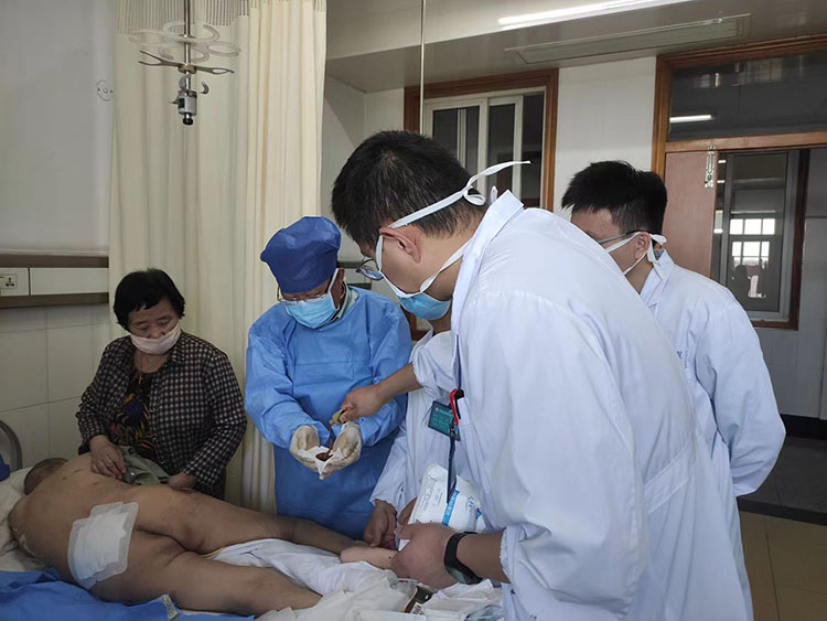 2024年4月18日,湖北宜昌枝江市人民醫(yī)院小城天使志愿服務(wù)隊(duì),枝江市人民醫(yī)院甲乳燒傷外科李翔主任,余春子護(hù)士長(zhǎng)和中國(guó)紅基會(huì)徐榮祥再生生命紅益基金會(huì)志愿者杜繼同志,到訪白洋鎮(zhèn)雅畈村薛師傅家中,開(kāi)展“送醫(yī)上門(mén),關(guān)愛(ài)燒傷創(chuàng)瘍患者”入戶(hù)隨訪活動(dòng)。薛師傅因4月8日突發(fā)癲癇意外燒傷,由于家庭人力物力等原因,在燒傷科住院幾天后遂自愿要求出院回家。李主任和余護(hù)士長(zhǎng)時(shí)刻心系患者病情,看到創(chuàng)面心痛不已。李主任第一時(shí)間專(zhuān)業(yè)規(guī)范換藥,并同家屬?gòu)?qiáng)調(diào)注意事項(xiàng),避免創(chuàng)傷進(jìn)一步加重。志愿者們還送來(lái)了大米和油,家屬感動(dòng)得熱淚盈眶,李主任鼓勵(lì)家屬以積極的生活態(tài)度應(yīng)對(duì)眼前難關(guān)。甲乳燒傷外科今后會(huì)繼續(xù)以群眾需求為導(dǎo)向,使出院患者的院外康復(fù)和繼續(xù)治療能得到科學(xué)、專(zhuān)業(yè)、便捷的醫(yī)療技術(shù)服務(wù)和指導(dǎo)。