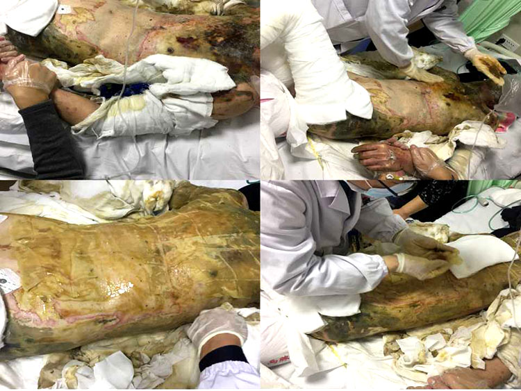 李主任陪同金教授與劉群峰醫(yī)生,張耀武醫(yī)生,鄭孟杰醫(yī)生,王帥醫(yī)生及于海洋醫(yī)生,共同會(huì)診了五位燒燙傷患者,一位雙足凍傷患者,一位疑似下肢栓塞并感染患者和一位丹毒患者。各位醫(yī)師在進(jìn)行再生醫(yī)療技術(shù)規(guī)范換藥過程中,積極同金教授探討技術(shù)要點(diǎn),如:怎樣探查壞死組織的深淺;創(chuàng)面壞死組織削除深淺及技巧等。當(dāng)大家會(huì)診到一位70%大面積燒傷高齡患者時(shí),在金教授和李主任的帶領(lǐng)下,科室全體總動(dòng)員,大家密切配合,規(guī)范操作,歷時(shí)近兩個(gè)小時(shí)完成創(chuàng)面治療!