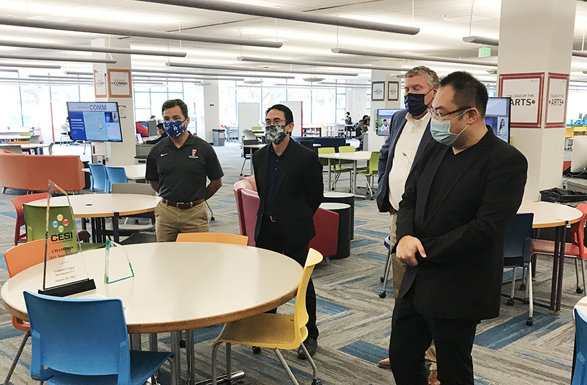 當(dāng)?shù)貢r(shí)間10月8日,美寶集團(tuán)董事局主席徐鵬攜洛杉磯周刊(LA Weekly)CEO Calle應(yīng)邀參觀考察了加州州立大學(xué)富勒頓分校電競(jìng)項(xiàng)目及電競(jìng)團(tuán)隊(duì)。加州州立大學(xué)富勒頓分校校長(zhǎng)Fram Virje(在線)、副校長(zhǎng) Greg Saks在校園現(xiàn)場(chǎng)熱情接待了徐鵬一行。校長(zhǎng)Fram Virje特別介紹了該校,表示富勒頓分校是整個(gè)加州學(xué)生數(shù)量最多的公立大學(xué),并對(duì)徐鵬對(duì)學(xué)校的支持及學(xué)生的指導(dǎo)表示了感謝。Saks副校長(zhǎng)特意帶領(lǐng)徐鵬一行參觀了富勒頓分校圖書館電競(jìng)中心,該校電競(jìng)隊(duì)伍今年斬獲了薩科拉門托國(guó)王隊(duì)主場(chǎng)體育館舉行的電競(jìng)比賽冠軍。