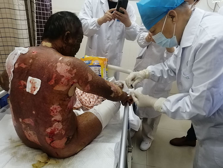 2022年11月18日,北京榮祥再生醫(yī)學(xué)研究所副所長、《中國燒傷創(chuàng)瘍雜志》編委金黨軍,江西省負(fù)責(zé)人陳立新,贛州地區(qū)負(fù)責(zé)人肖曉春應(yīng)信豐縣人民醫(yī)院燒傷創(chuàng)面修復(fù)劉主任、何醫(yī)生的邀請,來到了該科室進行學(xué)術(shù)交流。在劉主任及科室醫(yī)護人員陪同一起會診了3例燙傷病人,并指導(dǎo)醫(yī)生應(yīng)用再生醫(yī)療技術(shù)規(guī)范換藥流程以及需要注意的事項,獲得了醫(yī)護人員和患者家屬的一致認(rèn)可和好評。