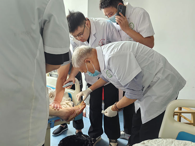 9月22日,應分宜縣中醫(yī)院外科主任林主任邀請,《中國燒傷創(chuàng)瘍雜志》編委、燒傷創(chuàng)瘍再生醫(yī)療技術臨床專家金黨軍前往該院為一例糖尿病足下肢潰瘍患者進行會診,并親自為患者進行清創(chuàng)換藥,示范再生醫(yī)療技術在治療糖尿病足的臨床規(guī)范應用,獲得了科室醫(yī)生的高度認可。