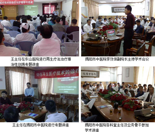 2009年2月27日來(lái)自中國(guó)中西醫(yī)結(jié)合學(xué)會(huì)燒傷專業(yè)委員會(huì)常委、北京燒傷創(chuàng)瘍研究所副所長(zhǎng)、燒傷治療專家王洪生教授來(lái)到揭陽(yáng)市中醫(yī)院講授皮膚器官原位再生復(fù)原技術(shù)。揭陽(yáng)市中醫(yī)院剛剛上任一周的謝院長(zhǎng)非常重視,業(yè)務(wù)副院長(zhǎng)李孝保親自作陪并主持本次的學(xué)習(xí)活動(dòng),醫(yī)務(wù)科組織了院內(nèi)的相關(guān)科室醫(yī)務(wù)人員30多人參加了本次題為“創(chuàng)瘍創(chuàng)面的再生治療”的學(xué)習(xí)。王洪生教授系統(tǒng)地把有關(guān)創(chuàng)面治療的發(fā)展以及當(dāng)前最先進(jìn)的治療方法—皮膚器官原位再生復(fù)原技術(shù)及其配套產(chǎn)品速愈貼在此領(lǐng)域取得的良好效果,用大量的圖片實(shí)例向醫(yī)護(hù)人員作了詳盡的講解。醫(yī)生們專心致志地作著筆記,學(xué)習(xí)結(jié)束后紛紛表示一定要把最好的治療效果好好應(yīng)用,造福百姓。趁著王主任的到來(lái),該院骨外科的醫(yī)生和護(hù)士還馬上邀請(qǐng)王教授到病房作現(xiàn)場(chǎng)指導(dǎo)。