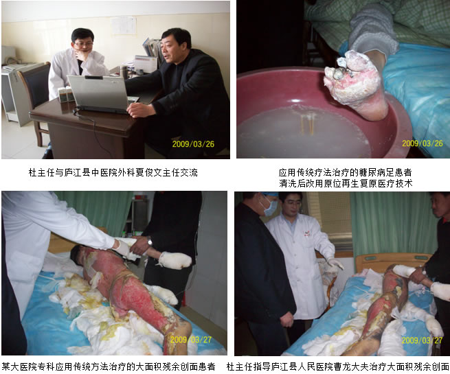 杜主任每到一家醫(yī)院利用電腦幻燈片資料詳細地介紹了皮膚原位再生復原醫(yī)療技術的臨床應用及國內外推廣情況,以及臨床療效和最新研究成果。并介紹了5.12四川大地震中應用皮膚原位再生復原醫(yī)療技術及皮膚再生復原醫(yī)療新產品速愈貼的臨床療效,引起了廣泛的社會效應,黨和國家給予肯定和表彰。在安慶海軍116醫(yī)院舉辦的外一、外二、骨科學術講座中收到良好效果,醫(yī)護人員積極認真參加學習,并先后和醫(yī)務處胡以法主任(蒹外科主任)、劉永慶主任、王啟懷主任進行座談交流。