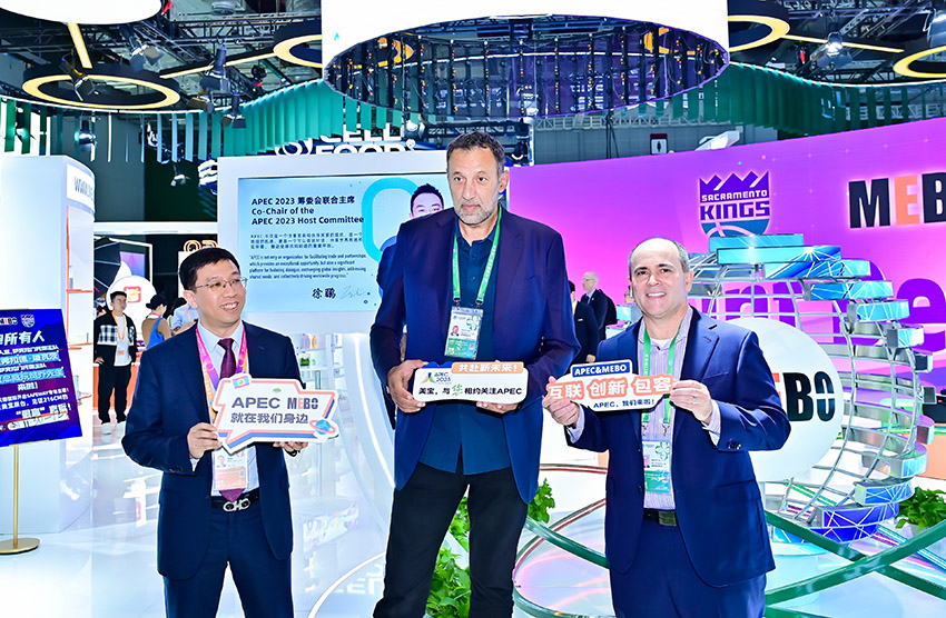 薩克拉門托國王隊運營總裁阮賀喬 (John Rinehart ) 以及NBA名人堂、薩克拉門托國王隊球星弗拉德·迪瓦茨(Vlade Divac)還專程到訪美寶展臺,全程打卡,品Safeway美食、試IMEBO產(chǎn)品,還特意品嘗了美寶APEC專供香油,可以喝的香油;迪瓦茨還在美寶迷你球場秀球技,APEC專區(qū)為APEC2023送上祝福;還進(jìn)入了天貓國際在美寶展臺進(jìn)行的北美特大食品零售巨頭Safeway的品牌專場直播間進(jìn)行了2米16版的“最高”直播!新奇元素,空前人氣,爭相合影,引爆了美寶展臺,帶給了進(jìn)博獨一無二的新鮮氣息。