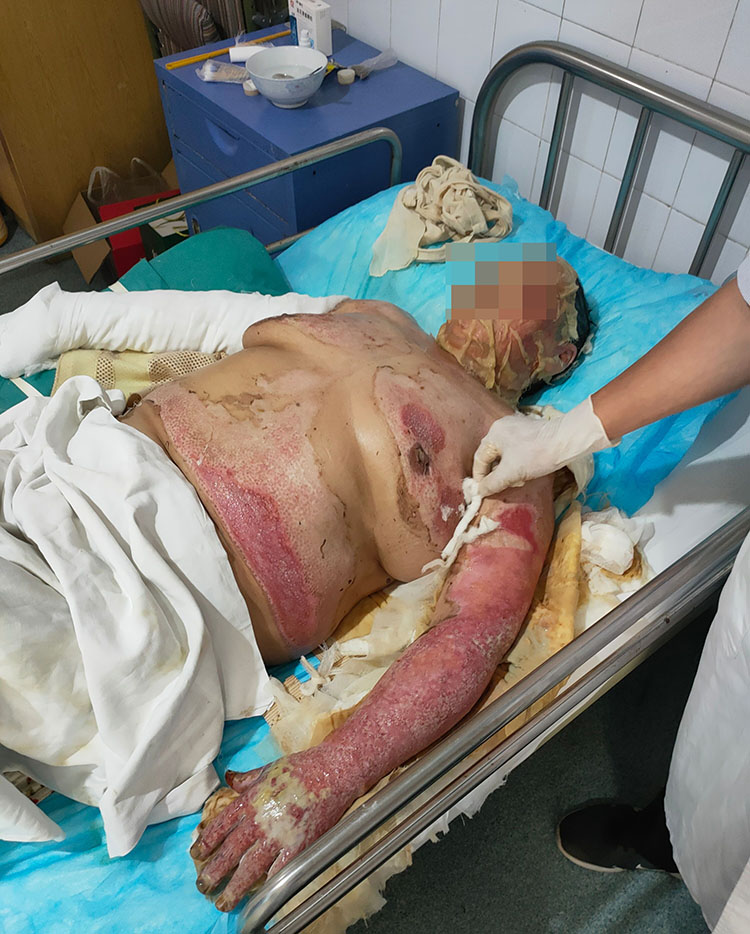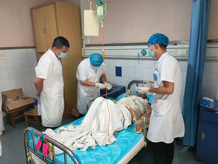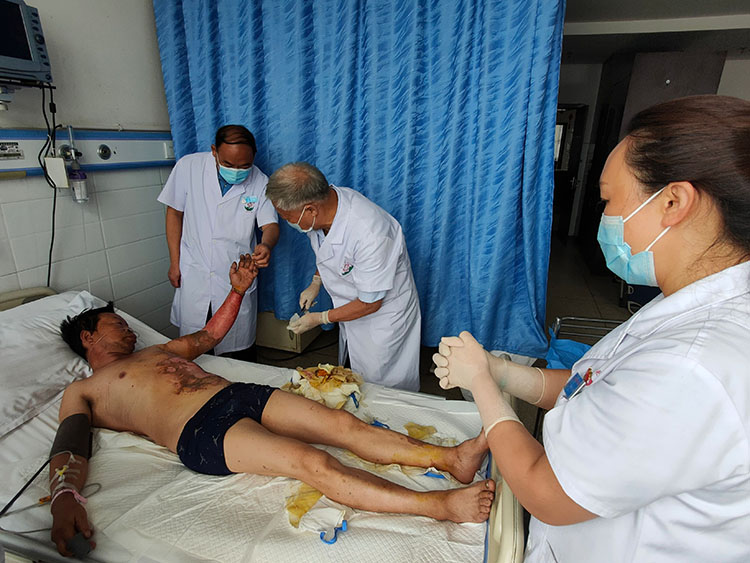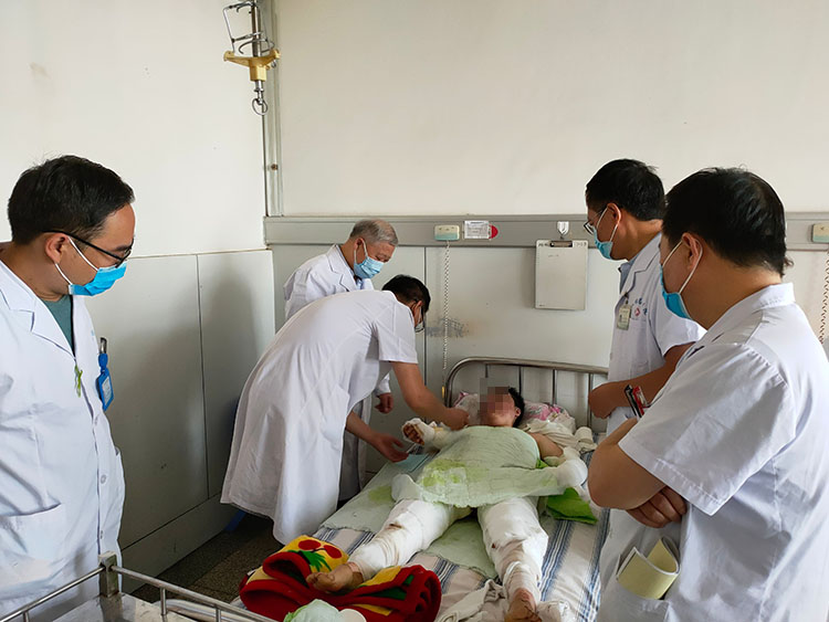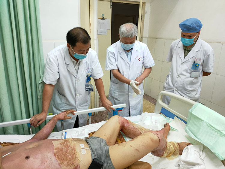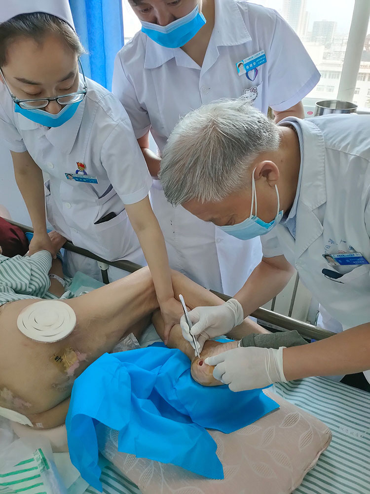 13日,金教授來到洛陽(yáng)第十人民醫(yī)院創(chuàng)面修復(fù)科,對(duì)科室收治的糖尿病液化氣爆炸傷病人進(jìn)行查房換藥,對(duì)科室的燒傷治療效果給予肯定。