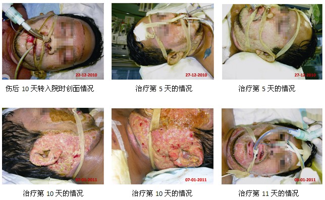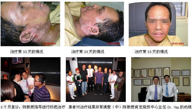 2010年11月,醫(yī)院收治了一例從外院轉(zhuǎn)來的汽油深度燒傷合并并嚴(yán)重吸入性損傷的患者(TBSA=22%,深I(lǐng)I度—淺III度),該患者是一名29歲的工程師,是在工作中被燒傷的,且燒傷部位主要集中在頭面部和雙上肢等重要功能部位和影響容貌的部位。為了使患者得到更好的恢復(fù)容貌和肢體的功能,醫(yī)院決定采用再生醫(yī)學(xué)技術(shù)治療治療這例大面積嚴(yán)重?zé)齻颊?,同時,為了更有把握地救治好該患者,燒傷整形中心的主任Dr. Yap Lok Huei馬上與中國燒傷創(chuàng)瘍科技中心的陳永翀主任取得了聯(lián)系,陳教授通過電話和電子郵件對該患者進(jìn)行了治療指導(dǎo),醫(yī)院燒傷中心的醫(yī)護(hù)人員全程采用燒傷再生醫(yī)學(xué)技術(shù)對患者進(jìn)行規(guī)范的治療。經(jīng)過33天的規(guī)范治療,患者的所有深度燒傷創(chuàng)面不需要植皮全部實現(xiàn)燒傷皮膚原位再生愈合的臨床效果。以下是頭、面、頸部深度燒傷早期的再生愈合情況和愈合后3個月隨訪的情況: