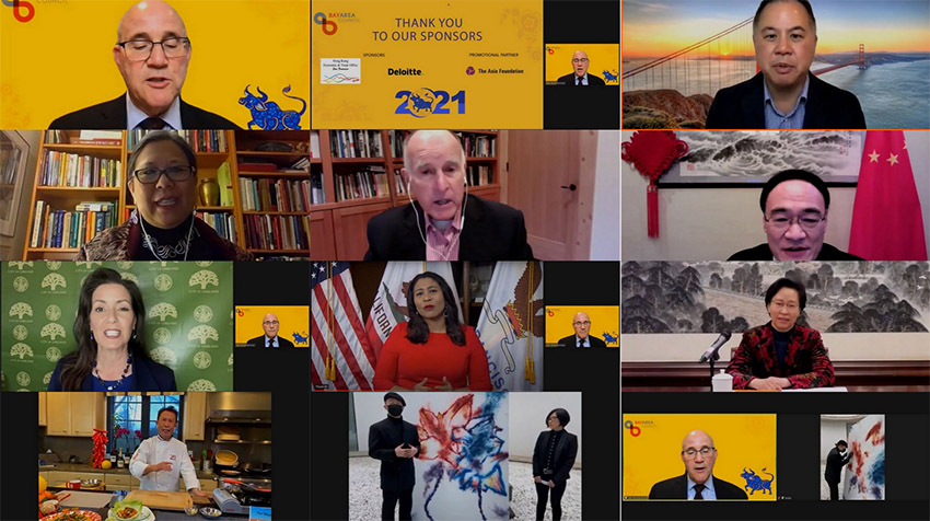 下午5點,新年慶?;顒诱介_幕,美國加州政府、中國上海楊浦等各區(qū)政府,以及江蘇省、廣東省、南京市、深圳市、九江市等各省市政府代表參會。中美雙方代表在線祝賀并致辭,共同為中國農(nóng)歷新年送上誠摯的祝福和希冀,大家期待在新的2021年能為建設(shè)更加和諧穩(wěn)定的中美關(guān)系與更美好繁榮的世界而攜手并肩,戮力前行。