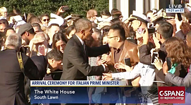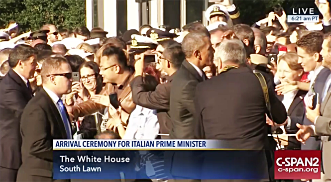 上午,盛大的國賓歡迎儀式在白宮南草坪舉行,19聲禮炮,閱兵,軍樂表演等儀式依次展開,兩國領(lǐng)導人巡視完三軍隊列后與到場貴賓依次握手寒暄表示熱情歡迎,看到徐鵬總裁,奧巴馬明顯非常高興,握手同時還給了個親兄弟式的大大的擁抱。隨后奧巴馬和倫齊分別發(fā)表講話,表達對雙方國家的關(guān)注和深化兩國友誼與合作的意愿。